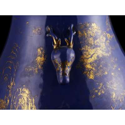 of archaistic hu form and generous proportion, the well-rounded sides deftly gilt with a continuous scene of deer in a mountainous landscape setting, the shoulder set with a pair of stag-head handles, the base with a six-character Qianlong seal mark