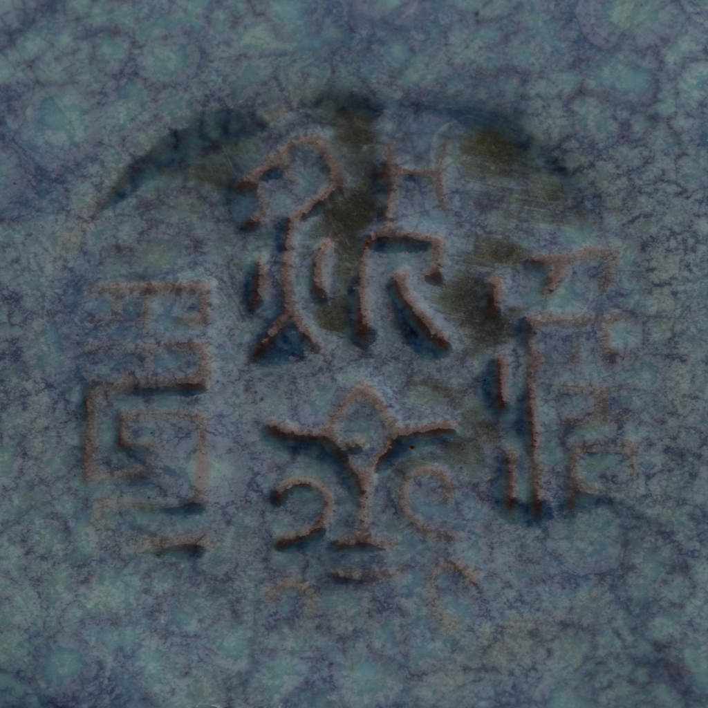 of square section, the exterior covered in a thick bright turquoise glaze suffused with marbled mottling