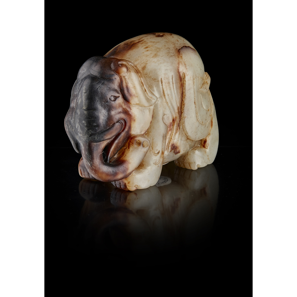 SMALL GREEN AND BROWN JADE CARVING OF AN ELEPHANT