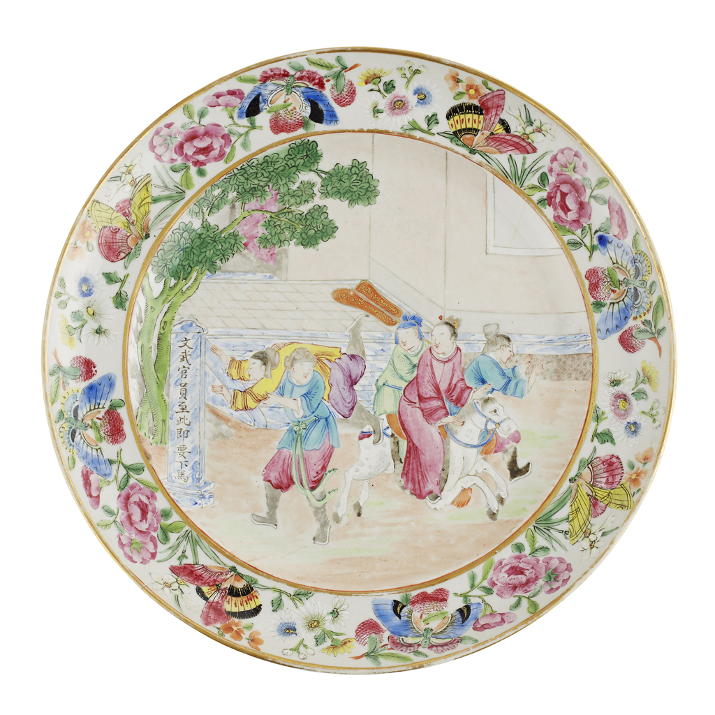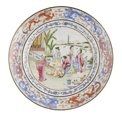 the first depicting wealthy ladies at leisurely pursuits on a lakeside terrace, the scene enclosed within a dragon border, the second depicting figures surrounding the 'Dismounting Stele' (xia ma bei), encircled by a butterflies and flowers border (2)