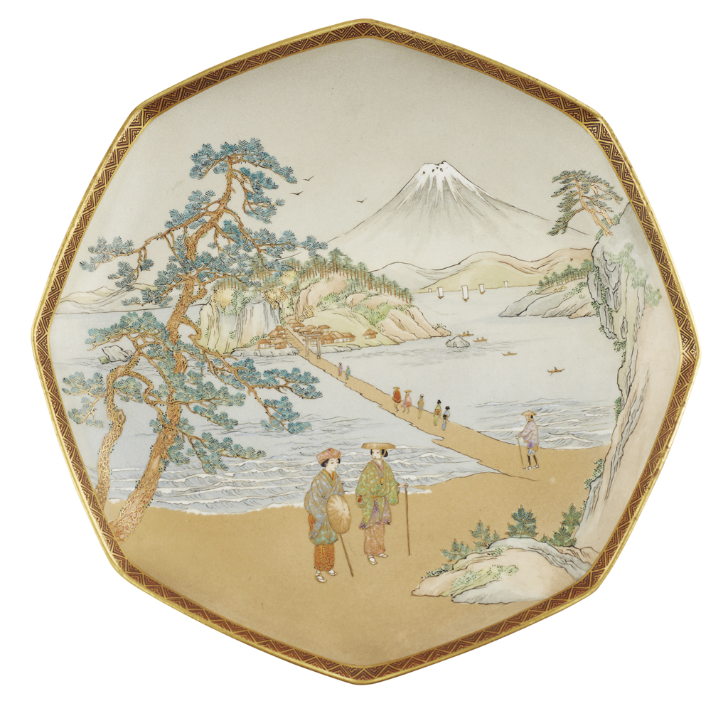 finely painted with figures on a causeway leading to an island, the Fuji Mountain forming the backdrop, signed Shozan within a rectangle and Koshida within an oval reserve