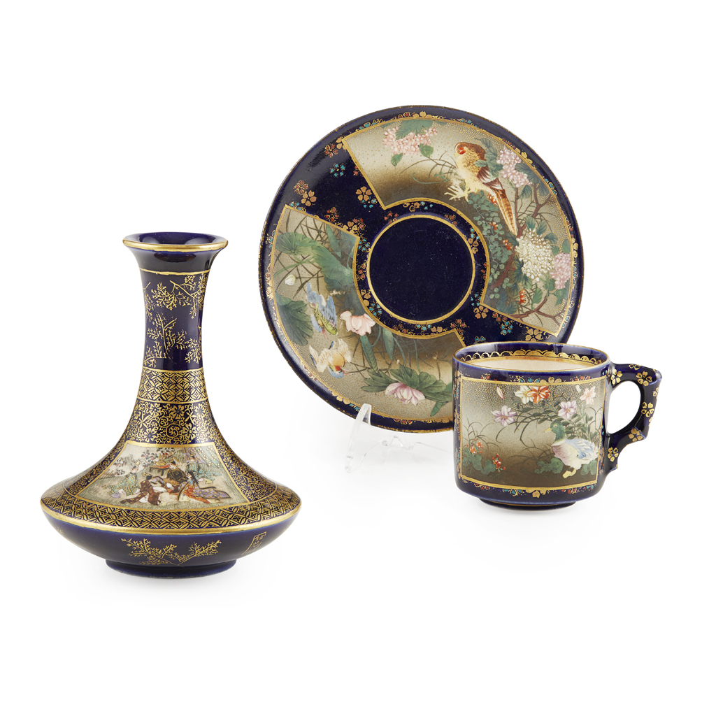 the cup decorated in enamels and gilt on a dark blue ground with two panels enclosing scenes of birds and flowers including a duck among flowers and a sparrow on a bamboo branch, the interior decorated with a flowering branch, the saucer decorated en suite; together with a SATSUMA BOTTLE VASE, KINKOZAN MARK, MEIJI PERIOD, 12cm high (3)