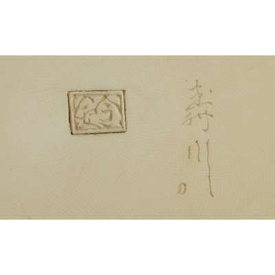 the elderly man standing and training a performing monkey in human attire with a hoop while supporting another on his back, a third monkey at his feet sounding a drum while clutching the pole of the hoop, incised Sugawa to the base