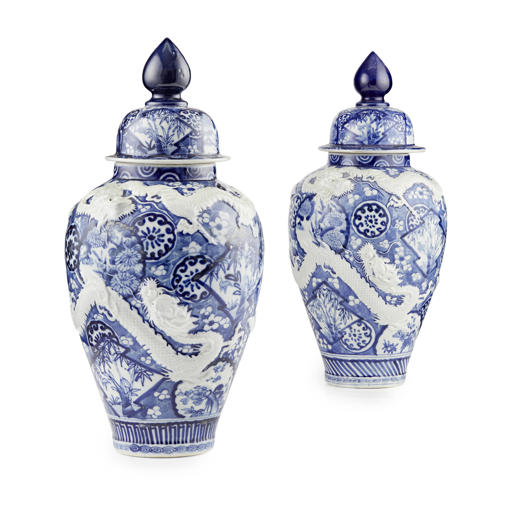 PAIR OF ARITA COVERED JARS WITH APPLIED DRAGONS