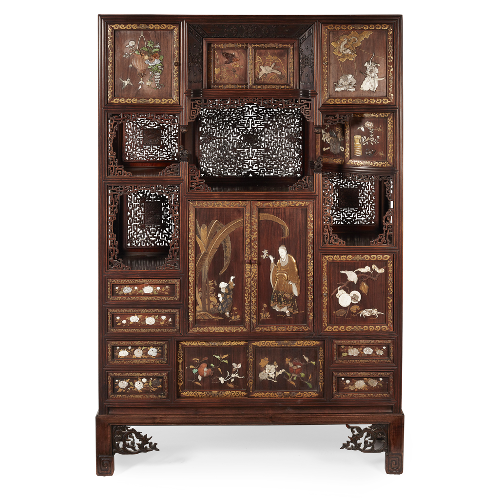 comprising an asymmetrical arrangement of open shelves and cupboards, including a pair of hinged doors finely inlaid with a male dignitary teasing a boy under a plantain tree, a hinged door on the upper right corner depicting two samurais bracing themselves for the attack by a mythical beast descending from heaven, the remaining sliding and hinged doors decorated with birds and a variety of seasonal flowers, with elaborate scroll-form cornicing and a pierced back panel to the mid-section, raised on an elongated rectangular stand of matching form