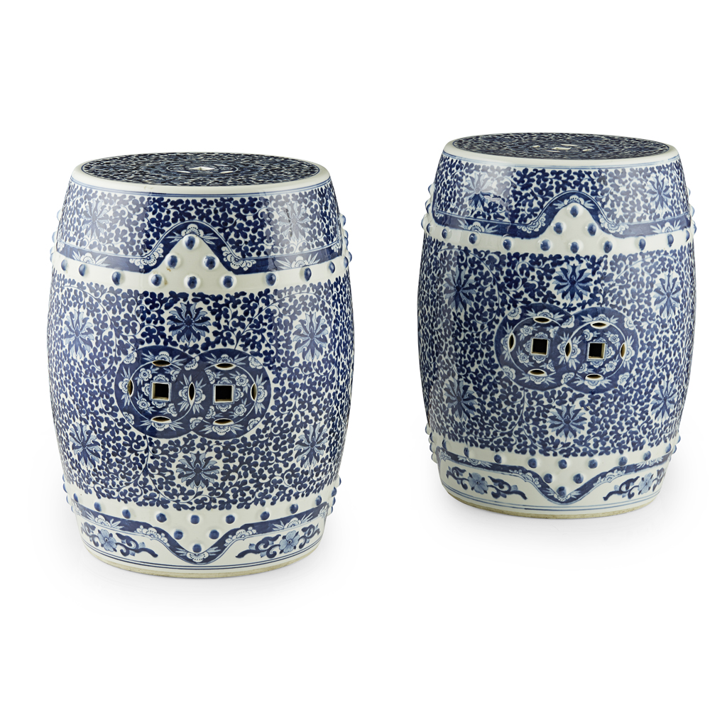 PAIR OF BLUE AND WHITE GARDEN SEATS