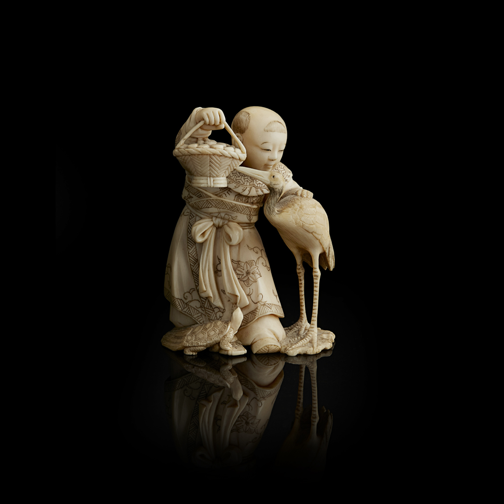 humorously carved with a boy trying to hold a crane back from eating the fruit held in his right hand, a turtle at his feet looking up at the scene, the base with an incised signature
