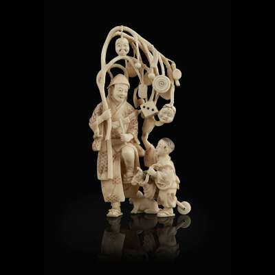 IVORY OKIMONO OF A TOY AND MASK SELLER Y