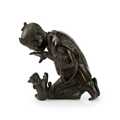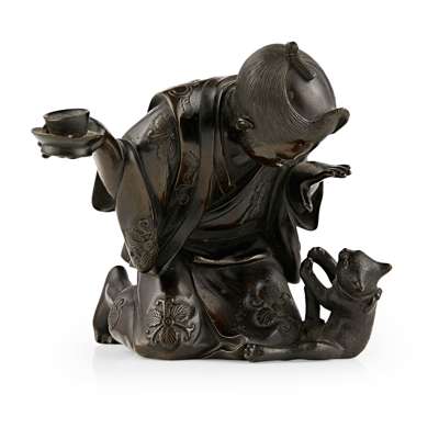 the boy shown kneeling and playing with a cat, apparently withholding food from the animal, his garments finely engraved with peonies on leafy scrolls