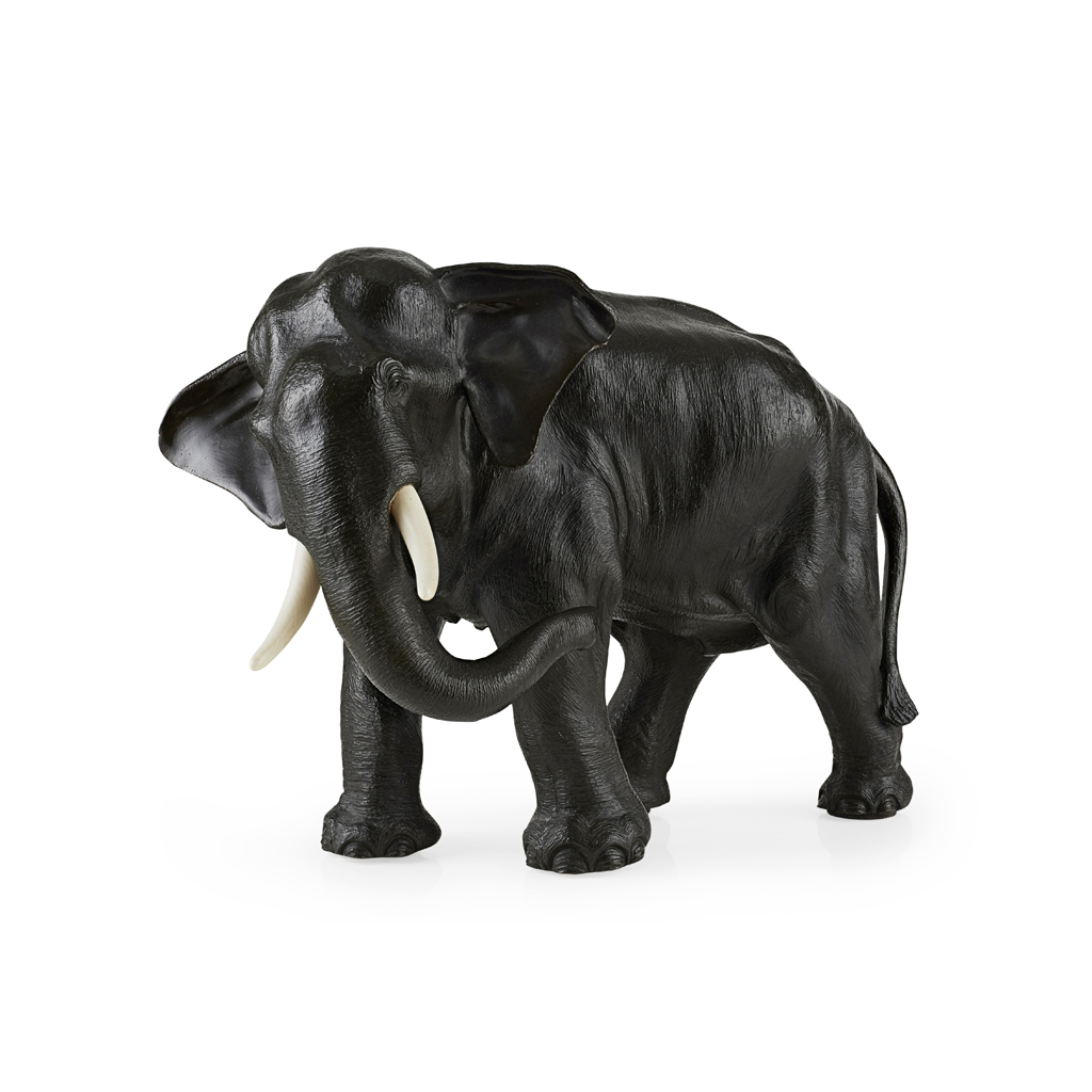 modelled in striding pose with trunk turned sideward between real ivory tusks, signed to the underside
