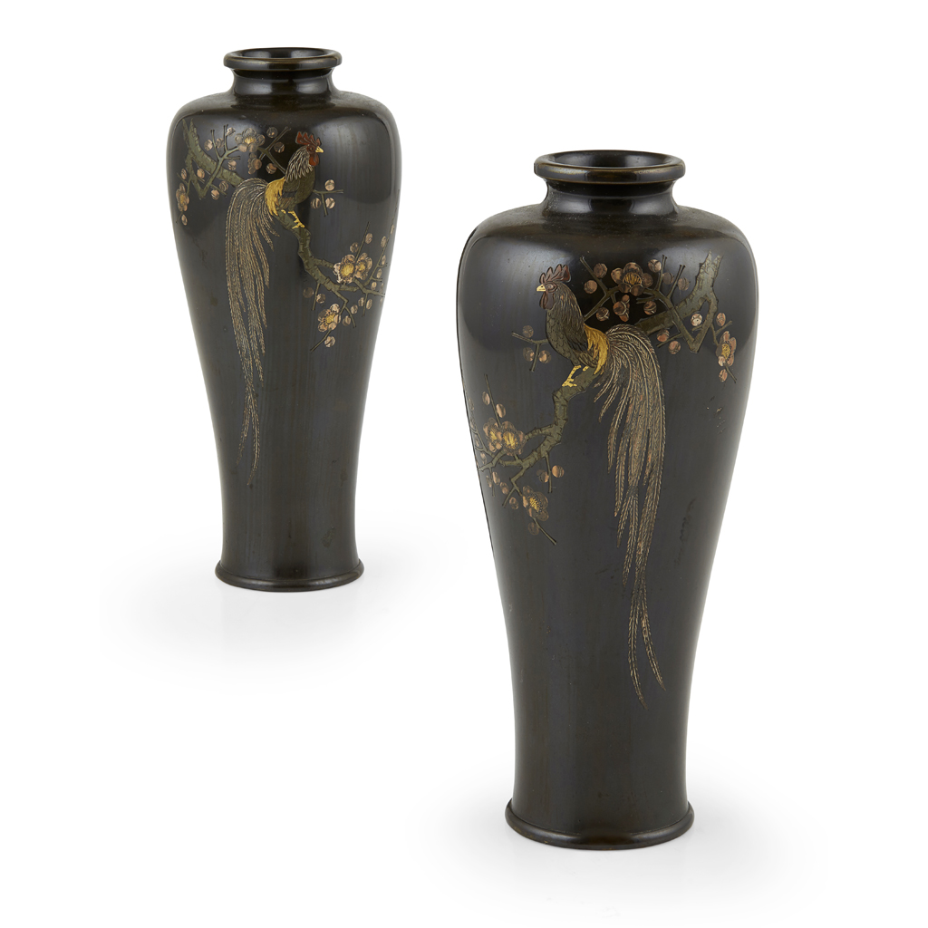 PAIR OF INLAID BRONZE 'COCKEREL' VASES