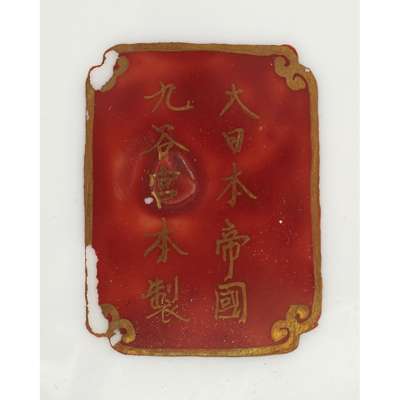 painted with children flying kites, an archer and his wife, a monkey plucking peaches and two fisherman in a boat, the scenes enclosed with a gilt iron-red border, the bases signed Dai Nihon Kutani Miyamoto-sei (4)