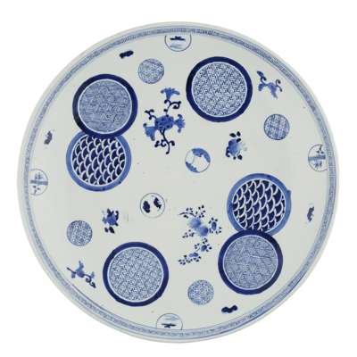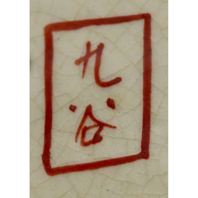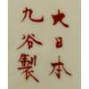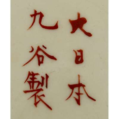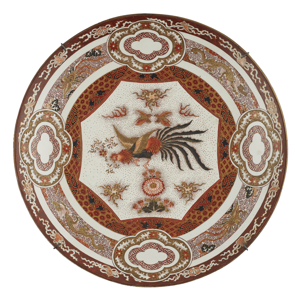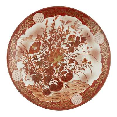 comprising: an Arita charger, decorated with circular medallions amongst scattered floral sprays; a Kutani charger, painted and gilt with birds above flowering branches, marked Kutani to the base; another Kutani charger, painted and gilt with a phoenix, marked Kutani to the base; and a Chinese style Kutani cup, painted with two characters from Wu Shuang Pu (The Book of Peerless Heroes), signed Hichozan Shinpo-sei to the base (4)
