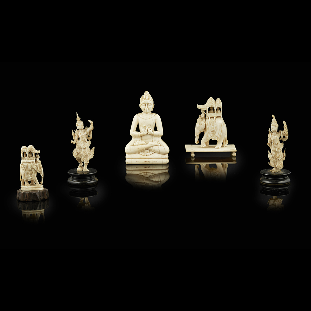 comprising: a Thai ivory figure of seated Buddha Shakyamuni; two small Thai ivory dancing figures; and two Indian ivory processional models depicting an elephant with a howdah, one raised on a rectangular platform base, the other attached to a wooden base (5)