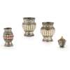 three in vase form, of porcelain with white metal mouths and feet, the silver embossed with lappets and bosses, the fourth a box of stepped cross section, the finial of the cover gilt and inset with a red hardstone (4)