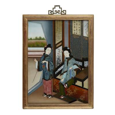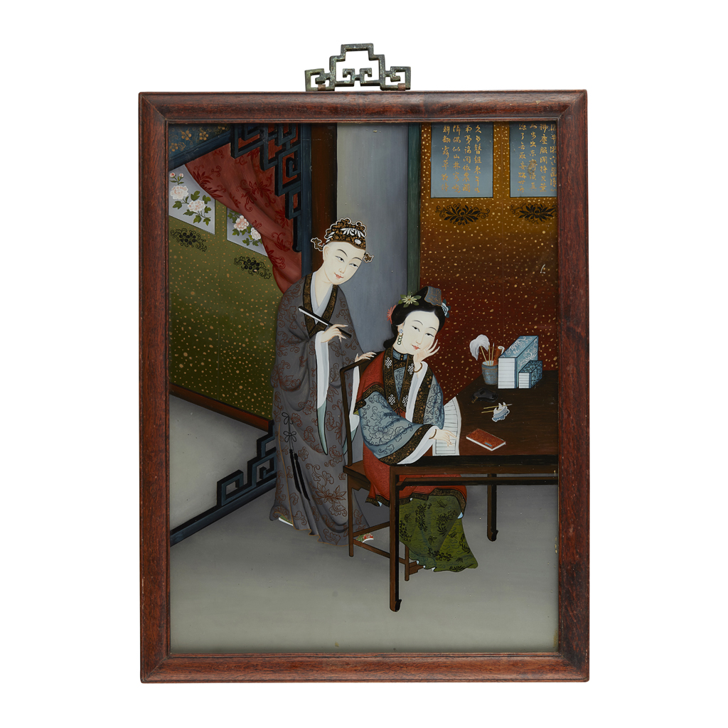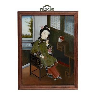 each depicting a beauty seated at leisure beside a paravent inscribed with a poem, accompanied in one painting by a maid and in another one by a young scholar, each painted in the traditional Chinese parallel perspective with a viewpoint from above (3)