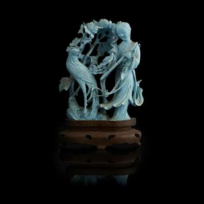 comprising: a coral figure of a female immortal with dragon, 12.5cm high; a small coral model of a quail, 2.4cm high; a turquoise figural group of He Xiangu beside a phoenix, 10.5cm high; a turquoise carving of a cockerel feeding a chick, 5cm high; a turquoise pendant depicting a female immortal, 5.1cm high; and a turquoise figure of a girl playing with a bird, 5cm high (6)