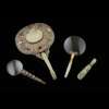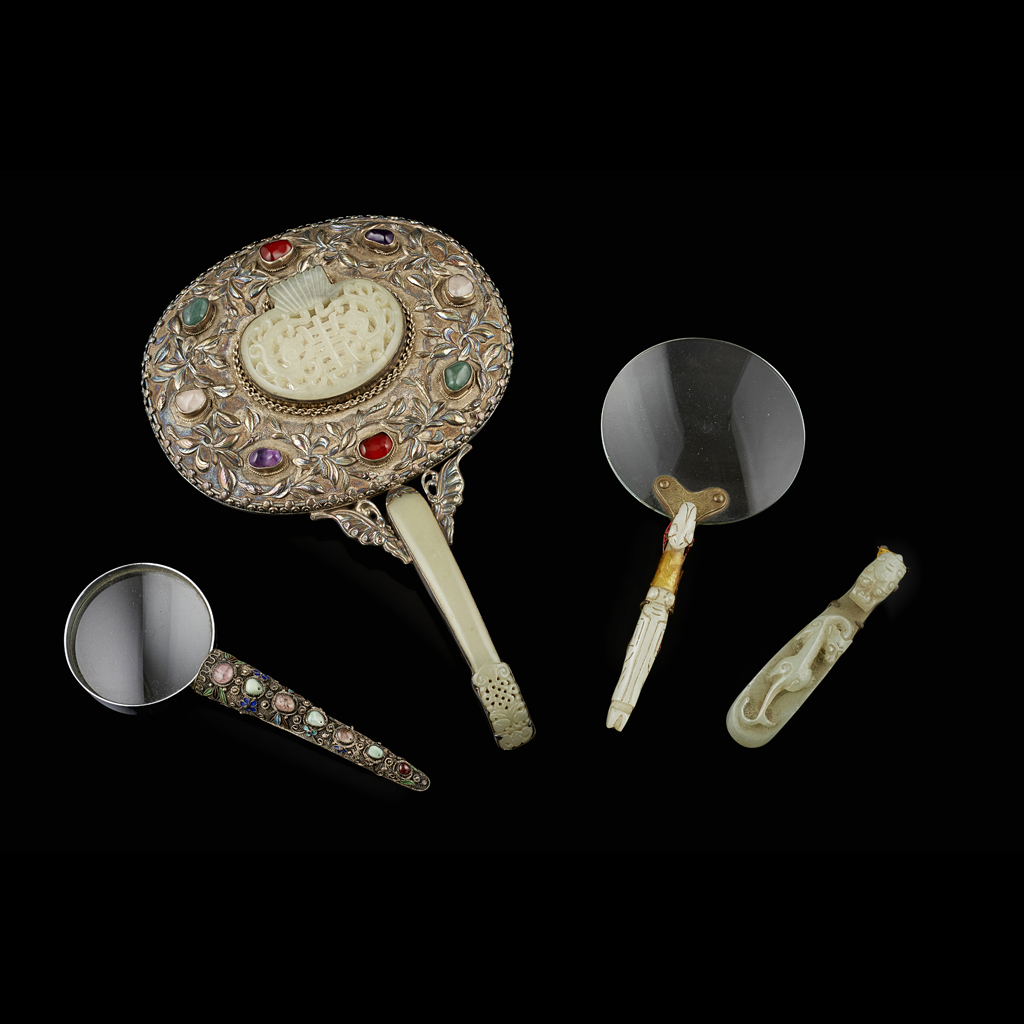 the central jade plaque reticulated with a Shou character flanked by a pair of phoenix, the border chased with scrolling leafy branches between hardstone embellishments, the mirror handle formed from a jade belt hook; together with TWO MAGNIFYING GLASSES, one mounted on a jade belt hook, the other on a hardstone embellished white metal handle; and a JADE 'DRAGON' BELT HOOK, carved with a chilong clambering towards the hook carved as a chilong head (4)
