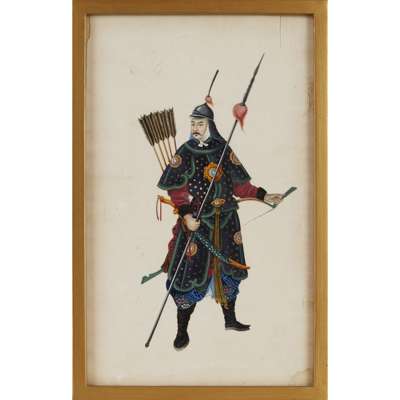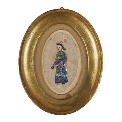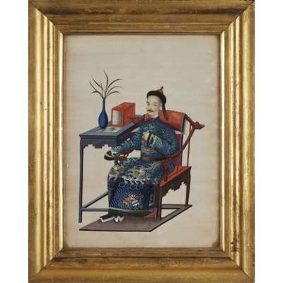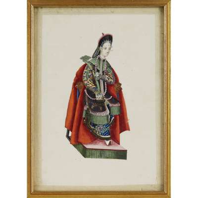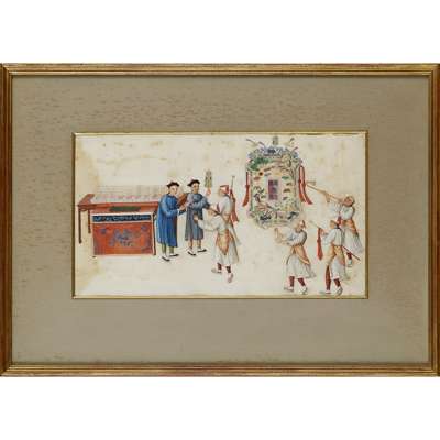 gouache on pith paper, depicting a young prince, a military official, a civil official, two wives of high-ranking officials and a festive parade, five of the paintings framed and glazed (6)