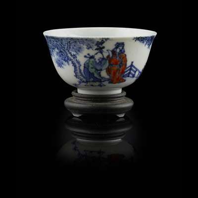 comprising: a Kutani bowl; an Arita barbed-rim 'dragon' dish; an Arita foliate-rim inscribed dish; a blue and white circular box and cover; a blue and white cylindrical cup; a stoneware twin-handle bowl; a stoneware footed bowl; two pewter-mounted dishes with floral decoration; and a Kyoyaki teacup, painted with Fukurokuju and two further immortals in a garden (qty)