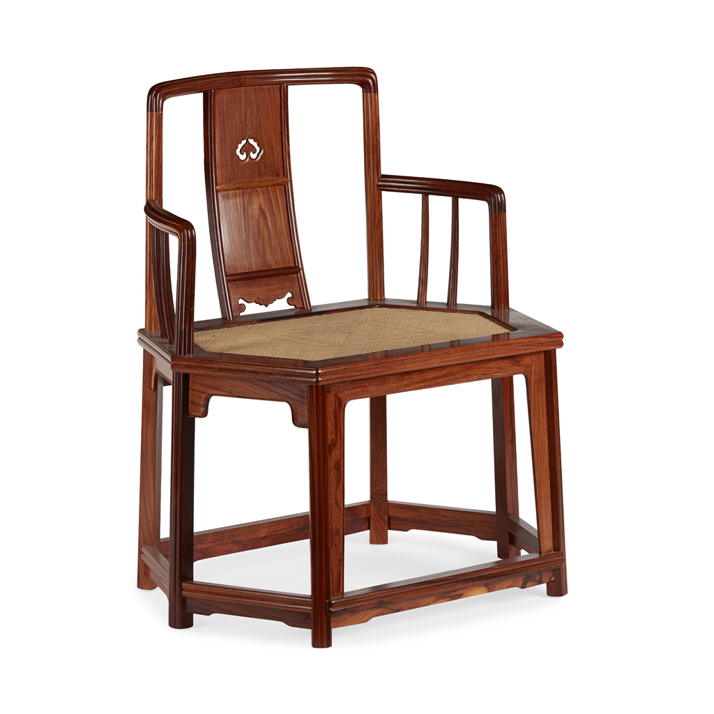 the double-cushioned straight top rail continuing down to a pair of straight arms pipe-joined to the frame, the central splat pierced with an openwork ruyihead and a scrolling base, all above a hard-mat seat within a hexagonal frame supported on four square section legs joined by stretchers (2)