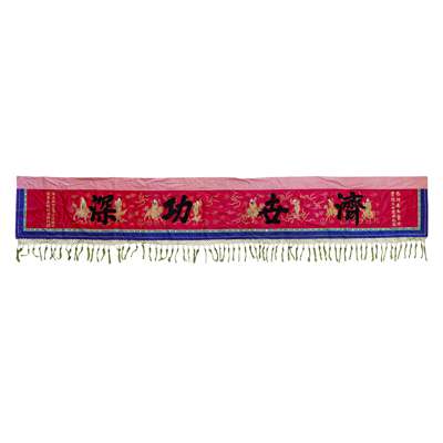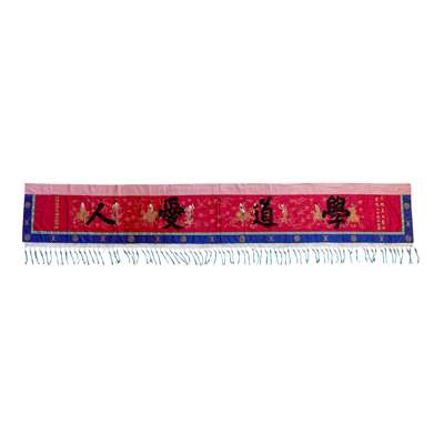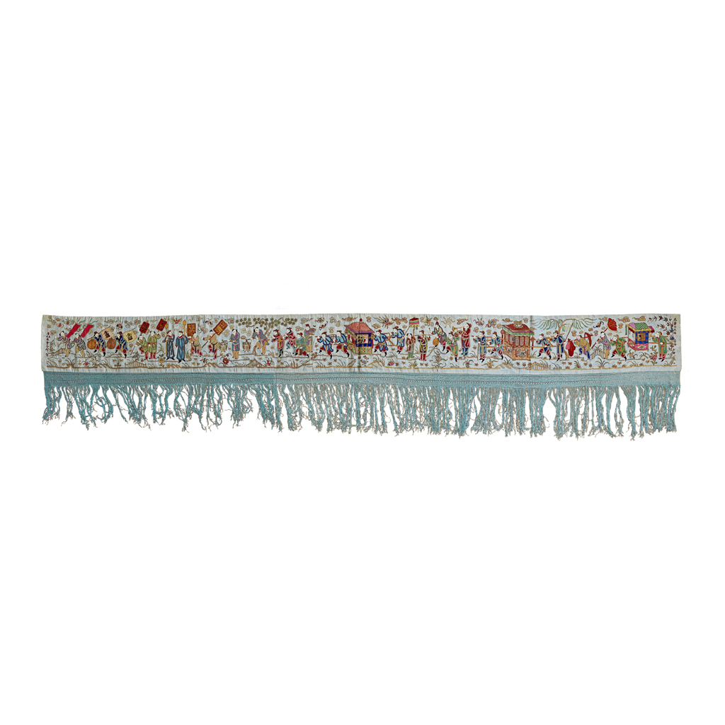 finely worked in polychrome and couched gold threads with the Eight Immortals amongst bats and lingzhi clouds, the first inscribed 'Xue Dao Ai Ren' (Study Tao and love fellow human beings), signed Hong Zhaoling (1876-1925), Defence Commissioner of Ting Zhang Administrative Division, the second inscribed 'Ji Shi Gong Shen' (Great Contribution to saving the world) and signed Wu Qixun, Staff Officer of Ting Zhang Administrative Division, both panels dedicated to 'Great Doctor Ba A Mei' (English name Dr Ahmed Fahmy, 1861 -1933, first Doctor of Western Medicine in the history of Zhangzhou) to celebrate the 30th anniversary of his practice in the region, with tasselled base, each 360x54cm; together with an EMBROIDERED SILK PALE GREEN GROUND 'WEDDING' PANEL, finely embroidered with a traditional Chinese wedding procession with a multitude of figures, dedicated by the Christian Church of the eastern and southern Zhangzhou region to Dr Fahmy to celebrate his wedding, 288x30cm (3)