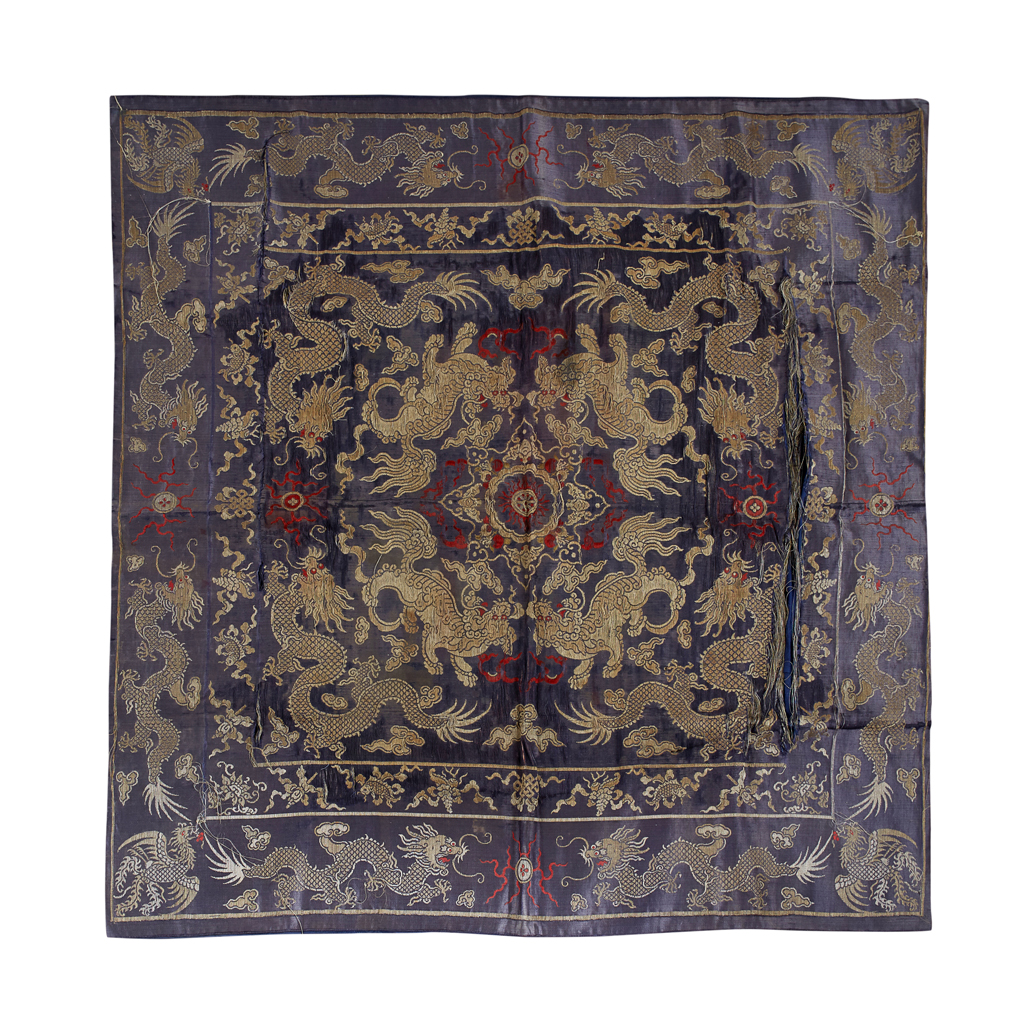of square shape, finely embroidered with four Buddhist lions encircling a central eight-petalled lotus flower, surrounded by four dragons chasing the flaming ball within a band of beribboned auspicious objects, the dragon motif repeated at the border