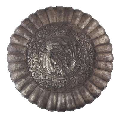 of lobed form, embossed with a central medallion enclosing a pair of phoenix in pursuit of each other