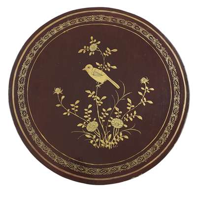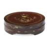 the wooden circular box and cover fitted with nine trays decorated with flowerheads borne on scrolling stems, the central circular dish with a large lotus flowerhead to the centre, the wood cover lacquered with a bird perched upon branches