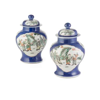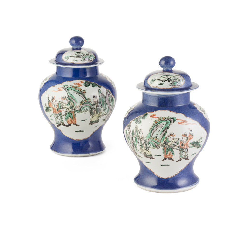 PAIR OF FAMILLE VERTE POWDER-BLUE GROUND BALUSTER JARS AND COVERS