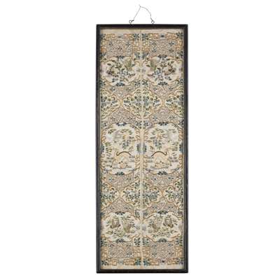 both pair of ivory colour, the first embroidered with shaped panels enclosing butterflies and flowers, reserved on a geometrical diaper ground, the second pair decorated with beauties at leisure in a traditional garden landscape, framed and glazed (2)