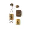 the first lacquered with a cockerel and a hen under bamboo, signed Hidenobu, with a manju netsuke decorated with cottage under pine and by a stream; the second decorated with a cat and a rat, unsigned; together with a CARVED AND PIERCED IVORY NETSUKE, depicting a bird surrounded by precious antiques, 4.5cm diam; and a SMALL LACQUERED METAL BOX AND COVER, 9cm long (4)