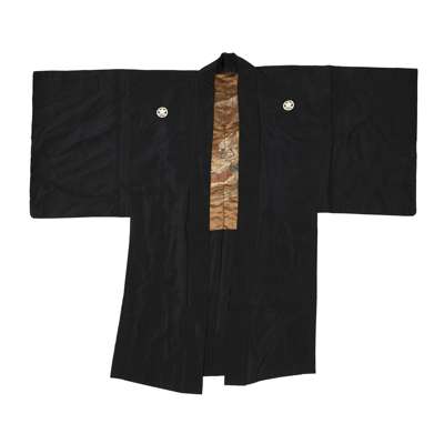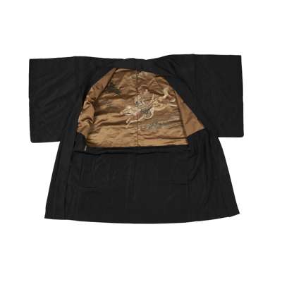 the interior decorated with a samurai on horseback, the exterior woven with emblems (mon) of the Tachibana clan; together with another BLACK GROUND SILK KIMONO, decorated on the lower section with cranes flying above crested waves past a landscape with pine trees and pagodas, 150cm high; together with an EMBROIDERED SILK PANEL, 20TH CENTURY, depicting cranes flying above pine trees and pagodas, 170cm long (3)
