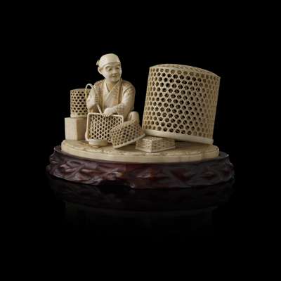 FINELY CARVED IVORY OKIMONO OF A BASKET MAKER Y