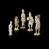 comprising: a sectional okimono of a beauty carrying a flower basket, signed Gyokuyuki; another smaller figure of a beauty, the head removable; two figures of fishermen, each carrying a basket filled with catch; and a figure of Gama Sennin carrying a toad, signed Gyokuzan in a red lacquered reserve (5)