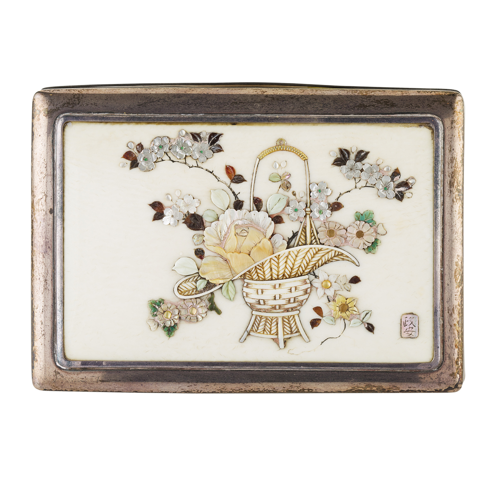 decorated in typical Shibayama style with flowers issuing from a basket, the ivory top panel signed Masayasu in an oval mother-of-pearl reserve, the base stamped 'silver'