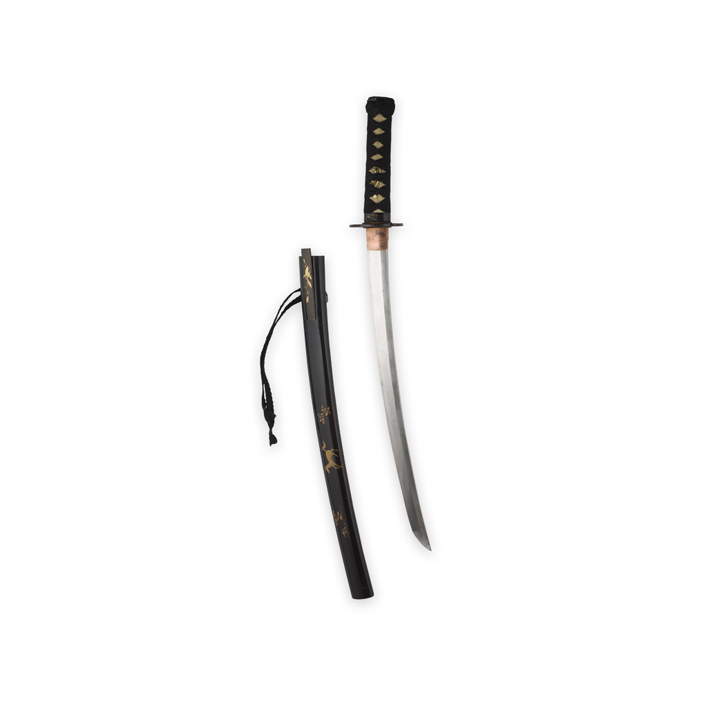 with short single rivet hole, unsigned tang, with curved blade with wavy temper line (Hamon), fish-skin grip with new binding and replacement menuki, pierced tsuba decorated with flower heads, black lacquer scabbard with gilt horse and with associated kozuka