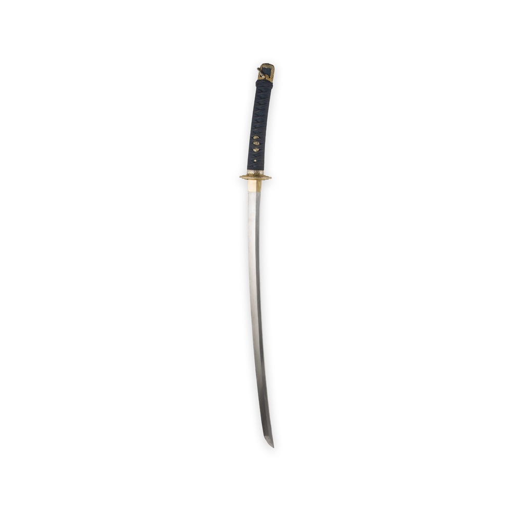 with single rivet hole, signed blade, curved blade with temper line, blue imitation fish skin grip bound with blue cord, the black leather scabbard with gilt metal mounts