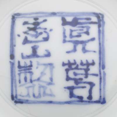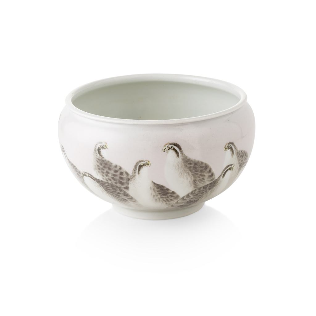 the exterior painted in fine inky washes with a wide frieze of quails huddled together, the eyes and beak picked out in yellow, all reserved on a delicate pink ground, the base marked in underglaze blue
