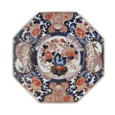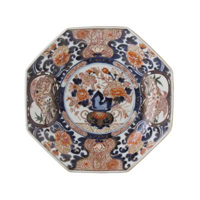 painted with a bonsai jardinière containing an arrangement of rocks and flowers, flanked by two shishi lions within lobed panels to the cavetto