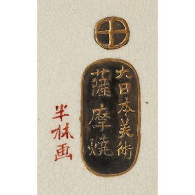 painted in coloured enamels and gilt over a crackle-glaze ground with a dynamic scene of warriors in combat, the chrysanthemum-shape rim decorated with alternating geometric and floral patterns, signed Hanbayahi in iron-red to the base beside a gilt 'Great Japan Fine Art Satsuma-Ware' mark