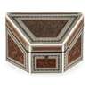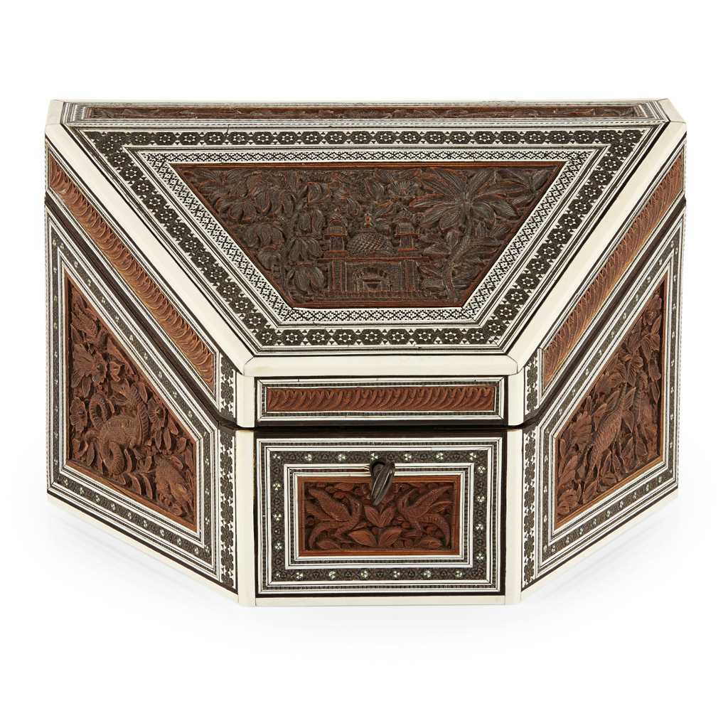 ANGLO-INDIAN CARVED WOOD, IVORY AND SADELI BANDED STATIONARY CASKET Y