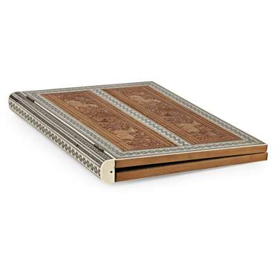 of canted outline, the hinged sloping lid, front, sides and back each inset with a wooden panel carved with architecture and animals amidst flowers and leaves; together with a similar ANGLO-INDIAN CARVED WOOD, IVORY AND SADELI BANDED BOOK-FORM BLOTTER, 28cm wide (2)