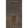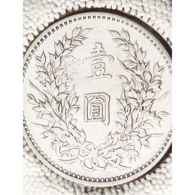 the cover engraved with three Peking opera actors possibly enacting a scene from The Romance of The Three Kingdoms; together with a SILVER ONE-DOLLAR YUAN SHIKAI COIN, inset into a small circular silver dish, 9.7cm diam; and a BRASS HAND WARMER, the exterior engraved with a continuous scene of figures travelling in a mountainous landscape on horseback, accompanied by retainers, 19cm long (3)