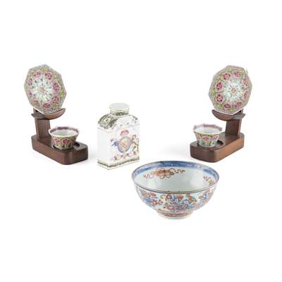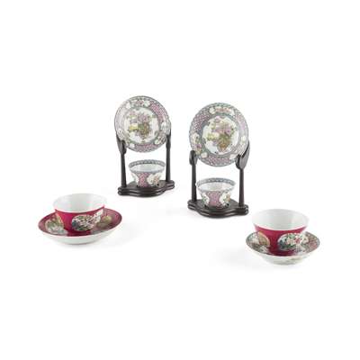 ASSEMBLED GROUP OF FAMILLE ROSE CUPS AND SAUCERS