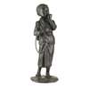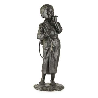 the boy shown standing on a circular plinth wearing a pair of sandals, clutching a hoop under the right arm and holding a stick in the left hand, possibly taking a break from the hoop trundling game, the face with a contemplative expression, signed within a square reserve on the surface of the plinth