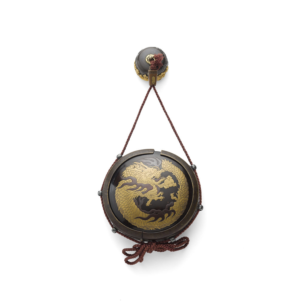 the circular incense box lacquered with a ferocious dragon clutching a pearl in its claws, the interior of nashiji, with a circular metal surround fitted with cord loops, with a mixed metal inlaid shakudo netsuke in the shape of a bell, decorated with two dragons striding amidst clouds, the ojime bead finely cast in relief with a bough of magnolia blossom