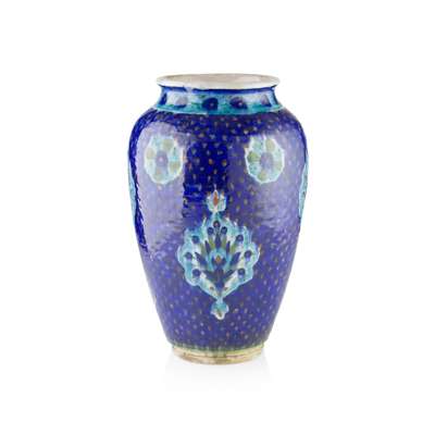 of tapering ovoid form below a waisted neck, painted in turquoise, blue and red on a dark blue ground with stylised flowerheads