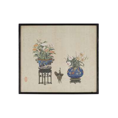ink and colour on silk, painted with jardinières, vases and censers issuing flowering plants, each bearing seal of Zhu Nan, framed and glazed (2)