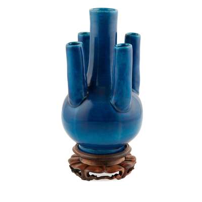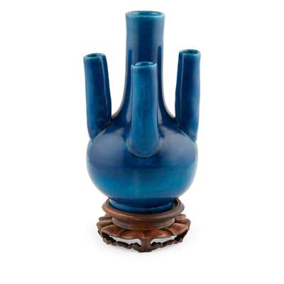 the globular body rising to four cylindrical necks flanking a taller central neck, applied overall save for the foot and base with a luscious peacock-green glaze, suffused with vary fine network of crackles, with a wooden stand